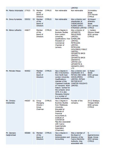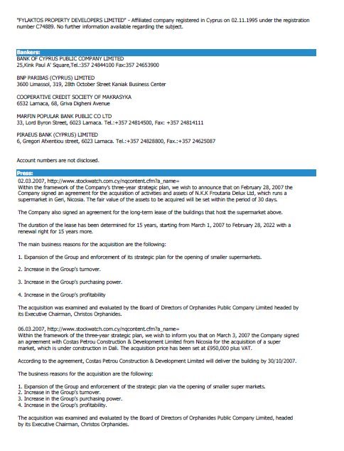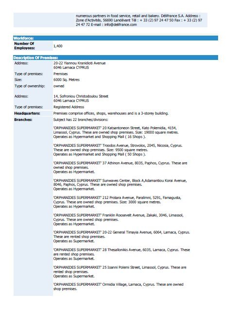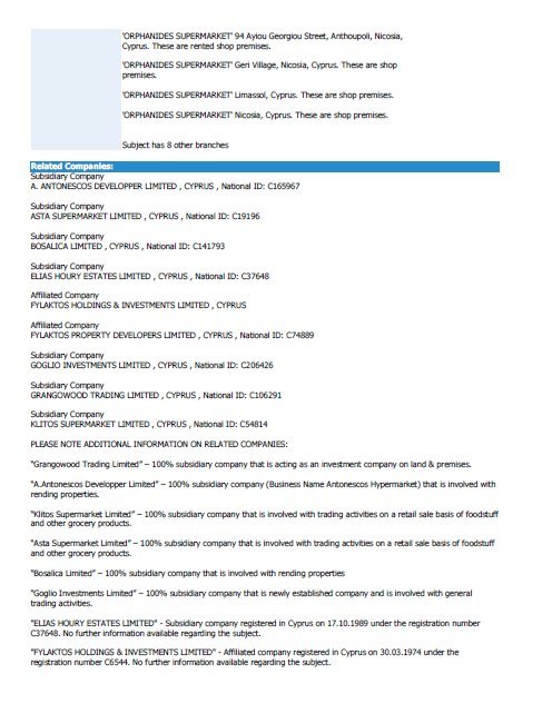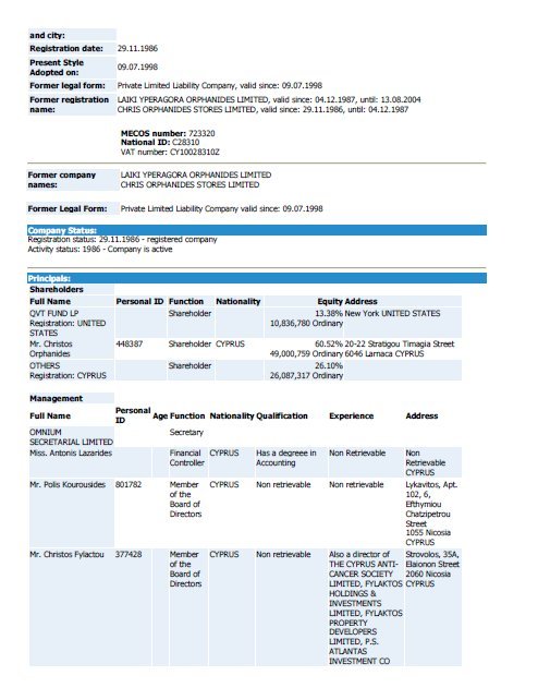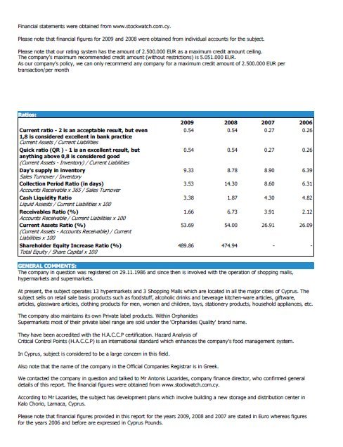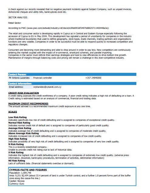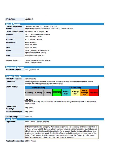 The Cyprus Company Report provides you with comprehensive information about the company, its financial situation, balance sheet data, credit limit and details about the management and shareholders. In summary, the company is evaluated via a rating index.