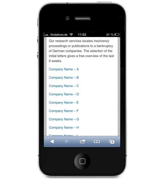 Today we are starting our great service “German Insolvency Proceedings Publications” free listings on smartphone for our international clients and visitors.
