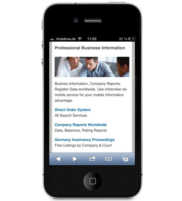 Usage is very easy – Start the infobroker.de WebApp by opening your mobile browser with the address http://mobile.infobroker.de