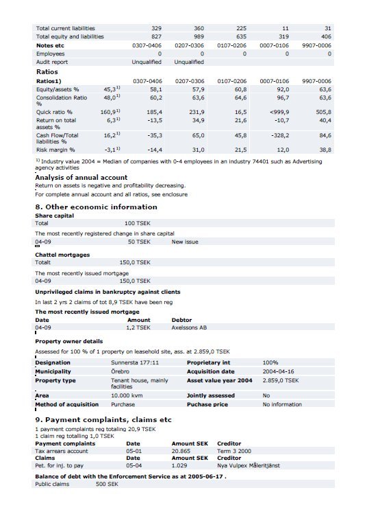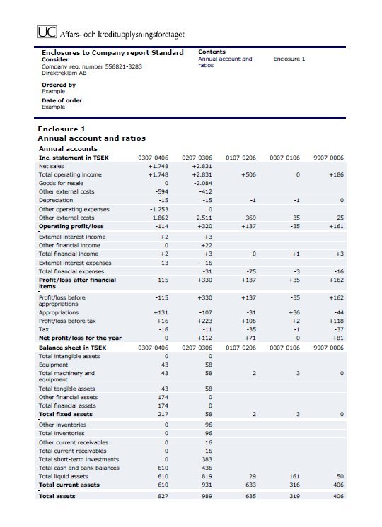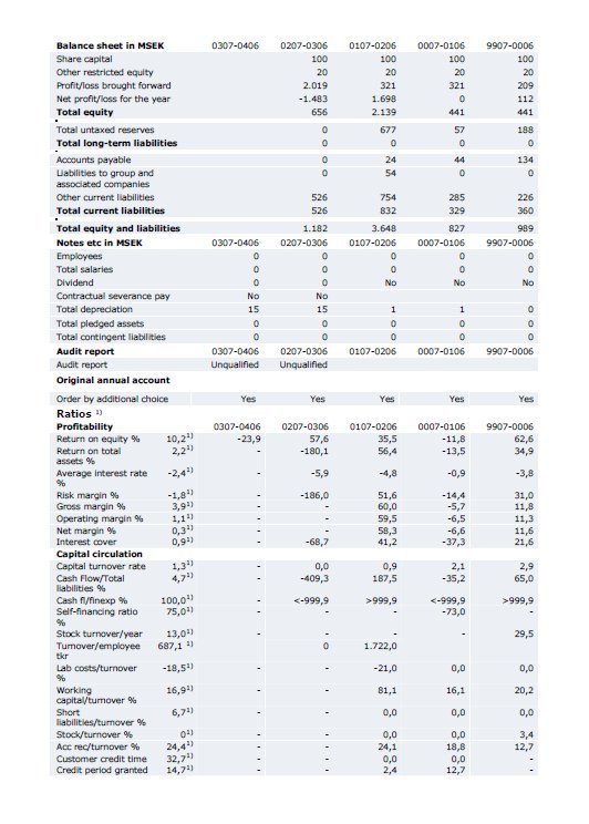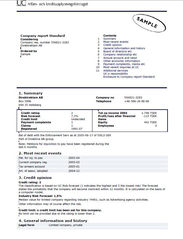 The Sweden Company Report provides you with comprehensive information about the company, its financial situation, balance sheet data, credit limit and details about the management and shareholders. In summary, the company is evaluated via a rating index. Reliable data from the Swedish Company Register for your business is included.